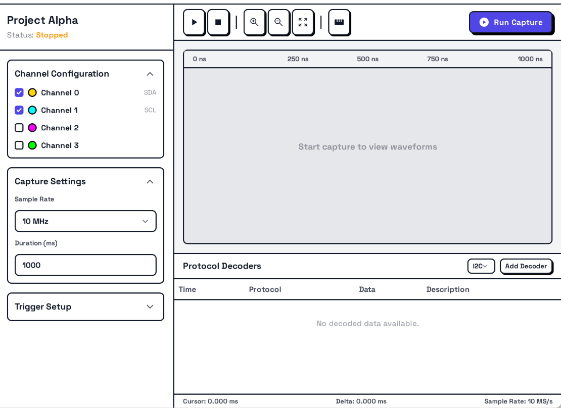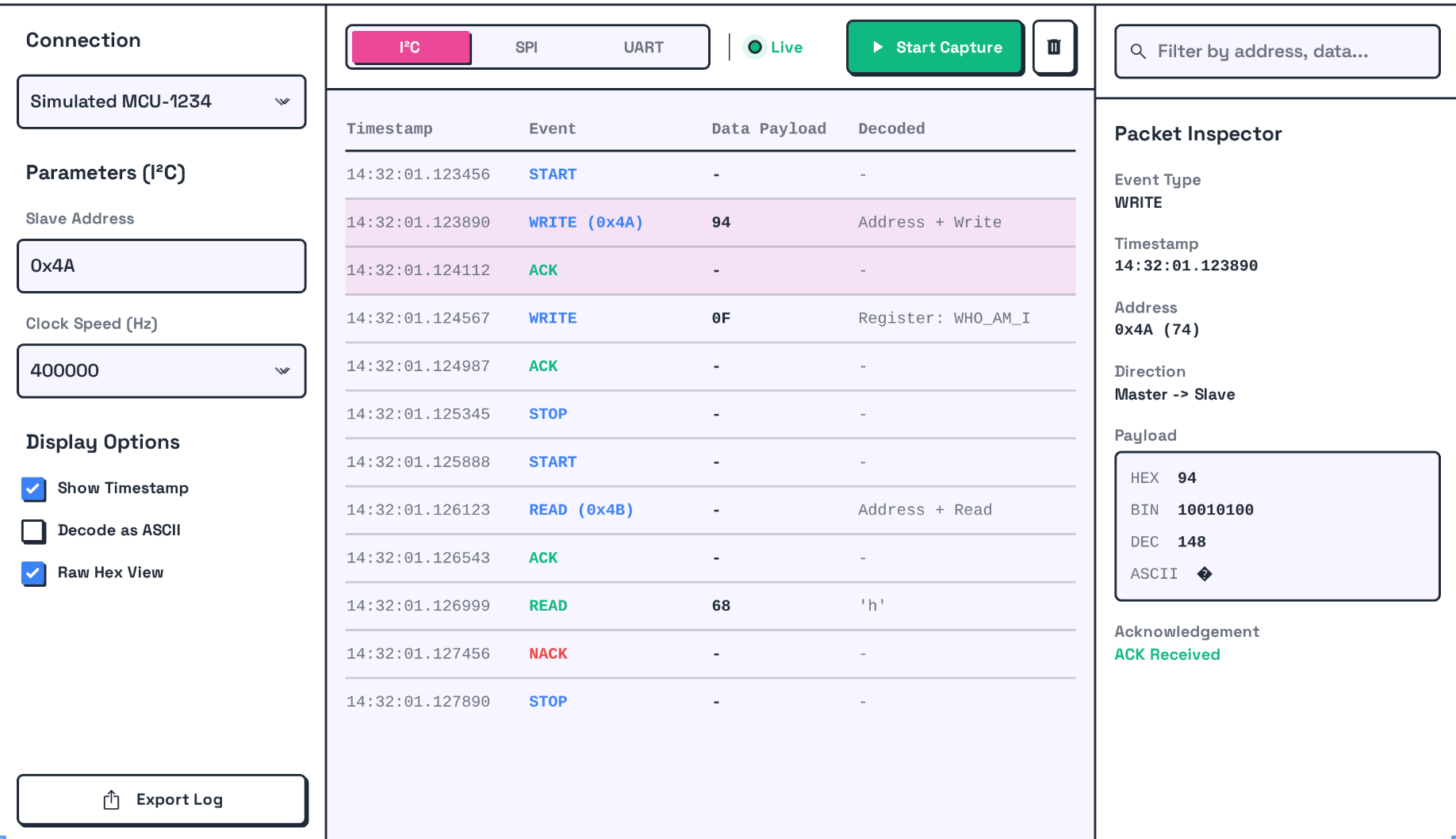 可监听仿真中的数字信号,并进行 I²C/SPI/UART 等协议解码。